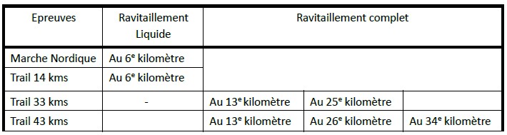 Spécifiquement pour les Trails de 33 et 43 km, une réserve d’eau d’au moins un litre ainsi qu’un téléphone mobile (ne pas masquer son numéro) doivent équiper les coureurs.